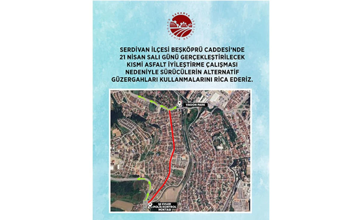 Büyükşehir Belediyesi, 21 Nisan Salı günü Serdivan Beşköprü Caddesi’nde gerçekleştireceği kısmi asfalt çalışması nedeniyle sürücülere alternatif güzergâhları tercih etmeleri konusunda uyarı yaptı.