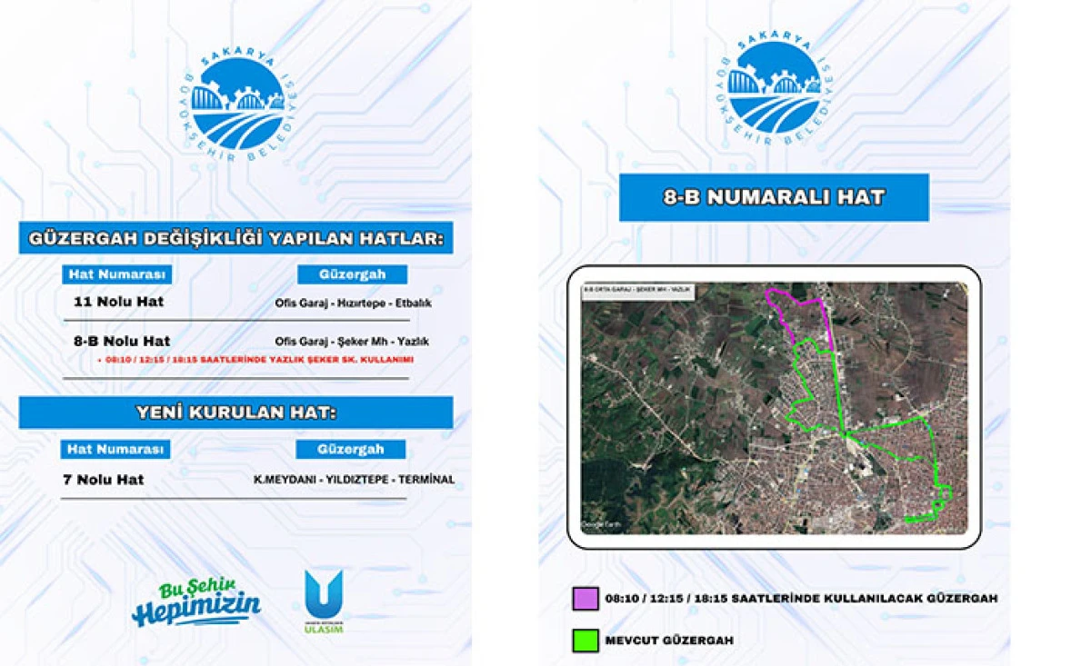 Yine aynı şekilde vatandaşlardan gelen talepler doğrultusunda ‘11’ numaralı Ofis Garaj- Hızırtepe-Et Balık hattı Serdivan’ın Yazlık bölgesine kadar uzatılırken ‘8-B’ numaralı Ofis Garaj-Şeker Mahallesi-Yazlık hattında ise belirli saatlerde güzergah değişikliğine gidildi. Bu kapsamda 8-B hattı saat 08.10, 12.15 ve 18.15 seferlerinde Yazlık Şeker Sokak güzergahından geçecek.