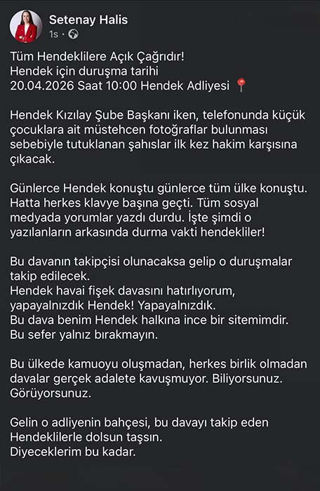 CHP Hendek Belediye Meclis Üyesi Avukat Setenay Halis, kamuoyunun merakla beklediği çocuk müstehcenliği davasının 20 Nisan’da gerçekleştirilecek olan ilk duruşmasına Hendek halkını davet ederek davanın takipçisi olmaya çağırdı.