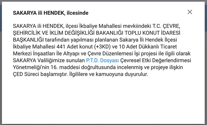 Çevre, Şehircilik ve İklim Değişikliği Bakanlığı Toplu Konut İdaresi (TOKİ) tarafından Hendek İkbaliye Mahallesinde 441 adet konut (+3 kapıcı dairesi) ve 10 dükkandan oluşan Ticaret merkezi için 24 Ekim’de Çevresel Etki Değerlendirmesi (ÇED) süreci başlatıldı.