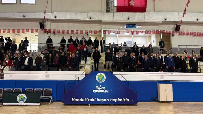Cumhuriyet meydanındaki törenin ardından Hendek Kapalı Spor Salonunda devam eden etkinlikler saygı duruşu ve İstiklal Marşı ile başlarken, etkinlikler Hendek Kaymakamı Hacı Hasan Gökpınar, Hendek Belediye Başkanı İrfan Püsküllü ve Hendek İlçe Milli Eğitim Müdürü Murat Çekiçcioğlu ile birlikte Öğrenciler ve halkı selamlayarak bayram tebrikleri ile devam etti.