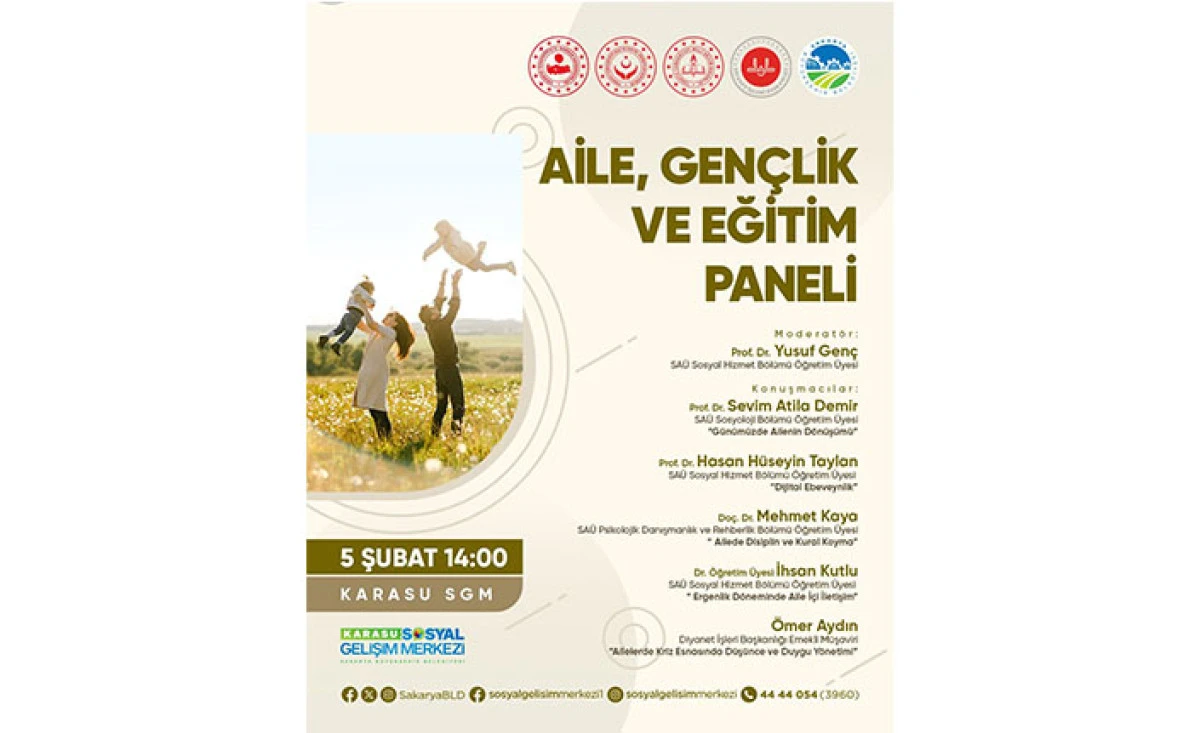 Büyükşehir Belediyesi, aile yapısının güçlendirilmesi ve gençlerin sağlıklı gelişimine dair farkındalık oluşturmak amacıyla “Aile, Gençlik ve Eğitim” paneli düzenliyor. Alanında uzman isimlerin katılacağı panel 5 Şubat Perşembe günü saat 14.00’da Karasu SGM’de gerçekleştirilecek.