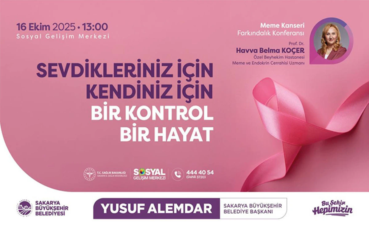 Meme kanseri farkındalık ayı kapsamında “Sevdikleriniz İçin, Kendiniz İçin: Bir Kontrol Bir Hayat” başlığı adı altında düzenlenecek konferans, 16 Ekim Perşembe günü saat 13.00’da Adapazarı Sosyal Gelişim Merkezi’nde gerçekleştirilecek.