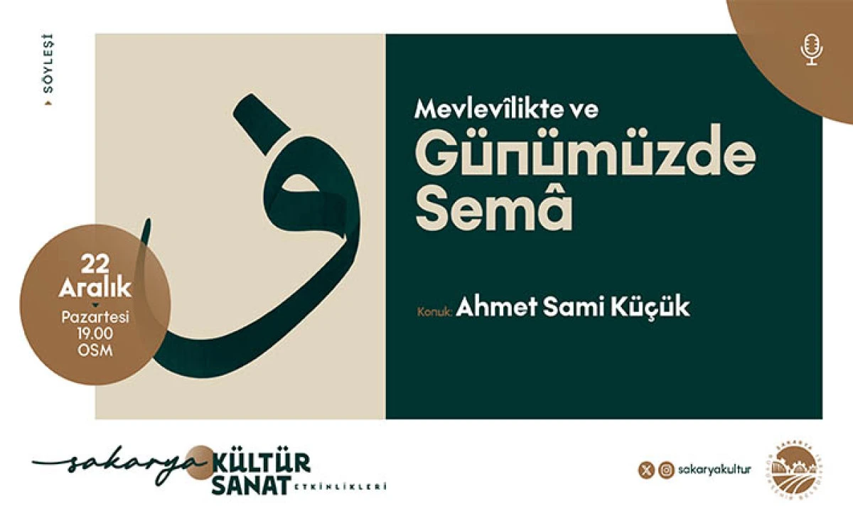 Sakarya Büyükşehir Belediyesi Kültür ve Sosyal İşler Dairesi Başkanlığı tarafından düzenlenen Aralık Kültür Sanat Takvimi, tasavvuf kültürünün önemli başlıklarından biri olan “Mevlevilikte ve Günümüzde Sema” konulu söyleşiyle, sanat ve kültür dostlarını bir araya getirecek.