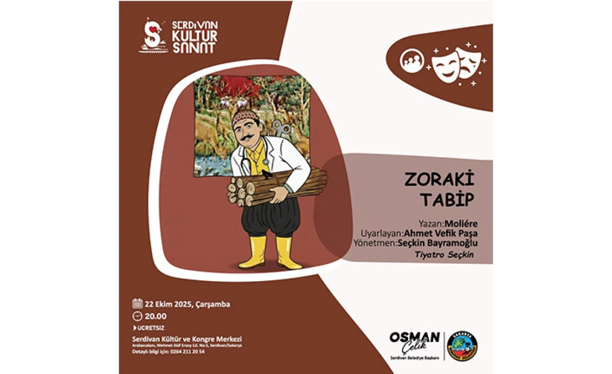 Serdivan Belediyesi Kültür Sanat yeni sezonunda, tiyatroseverleri Molière’in ölümsüz eseri "Zoraki Tabip" ile buluşturuyor. Ahmet Vefik Paşa uyarlaması olan bu klasik komedi, 22 Ekim 2025 Çarşamba günü saat 20.00’de Serdivan Kültür ve Kongre Merkezi’nde sahnelenecek.