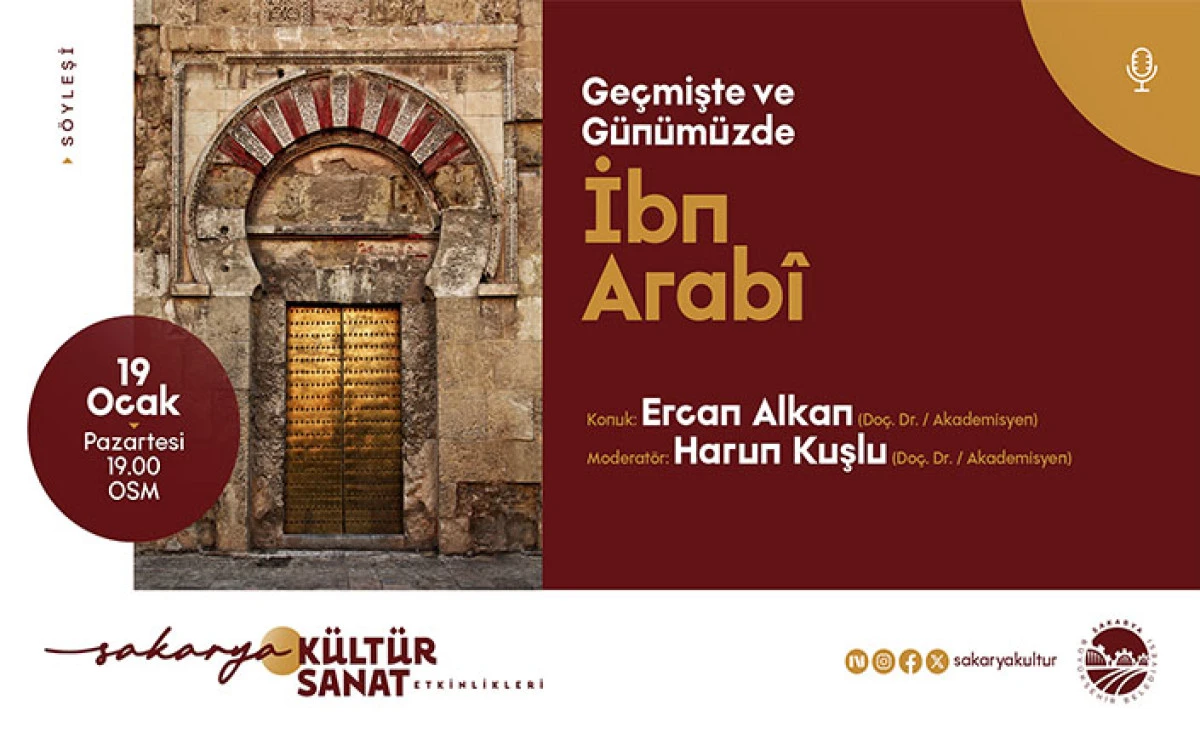 19 Ocak Pazartesi günü Ofis Sanat Merkezi’nde “Geçmişte ve Günümüzde İbn Arabi” adlı söyleşi programı gerçekleştirilecek. Saat 19.00’da başlayacak programa Doç. Dr. Ercan Alkan konuşmacı olarak katılacak. Söyleşinin moderatörlüğünü ise Doç. Dr. Harun Kuşlu üstlenecek.