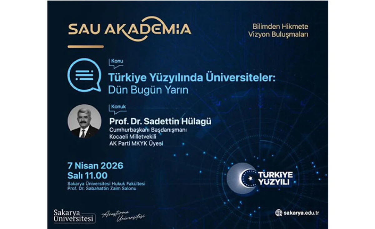 “Türkiye Yüzyılında Üniversiteler: Dün Bugün Yarın” başlığıyla gerçekleştirilecek program, 7 Nisan 2026 Salı günü saat 11.00’de Sakarya Üniversitesi Hukuk Fakültesi Prof. Dr. Sabahattin Zaim Salonunda yapılacak. Programda, Türkiye Yüzyılı vizyonu çerçevesinde üniversitelerin geçmişten günümüze gelişimi ve gelecekte üstleneceği roller ele alınacak.