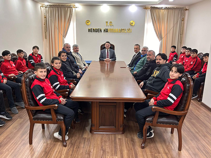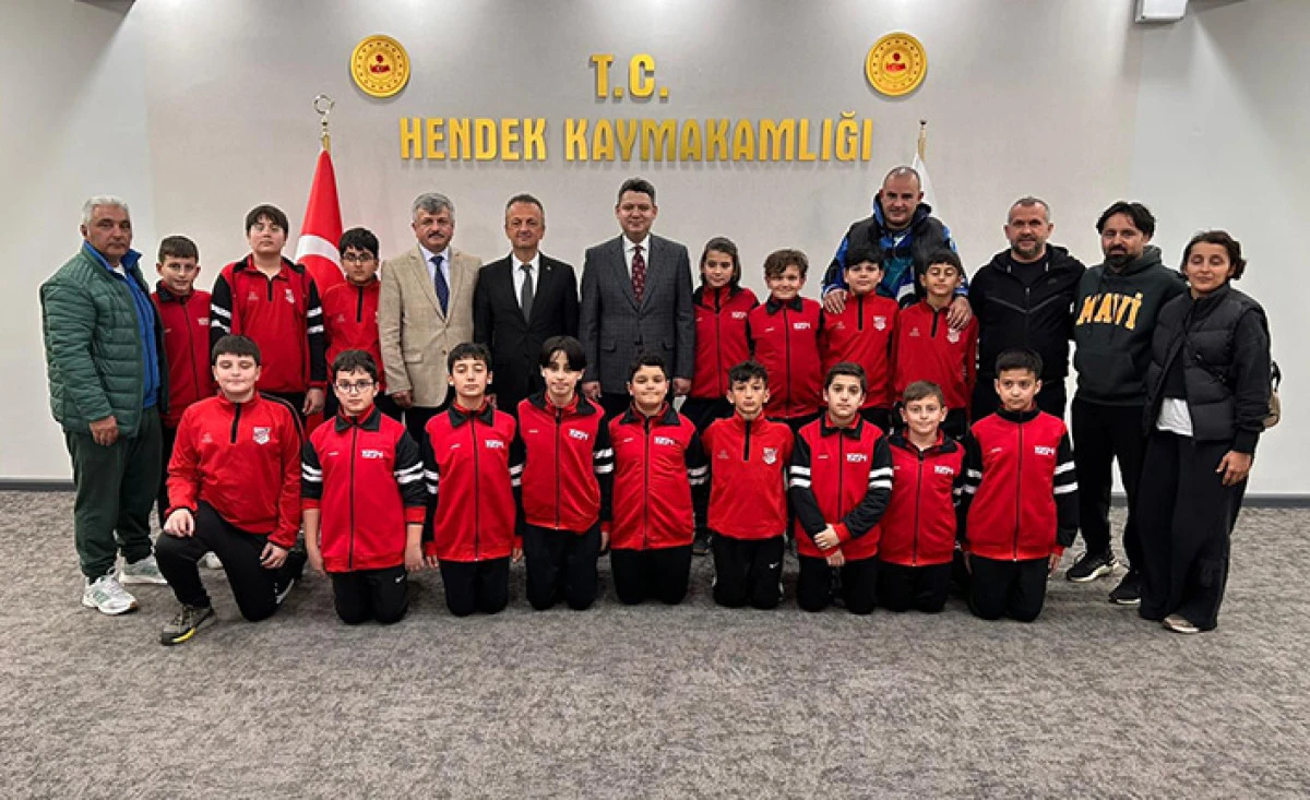 Hendek Şehit Mahmutbey Ortaokulu Hentbol Takımı Sporcuları Hendek Kaymakamı Hacı Hasan Gökpınar’ı makamında ziyaret etti.