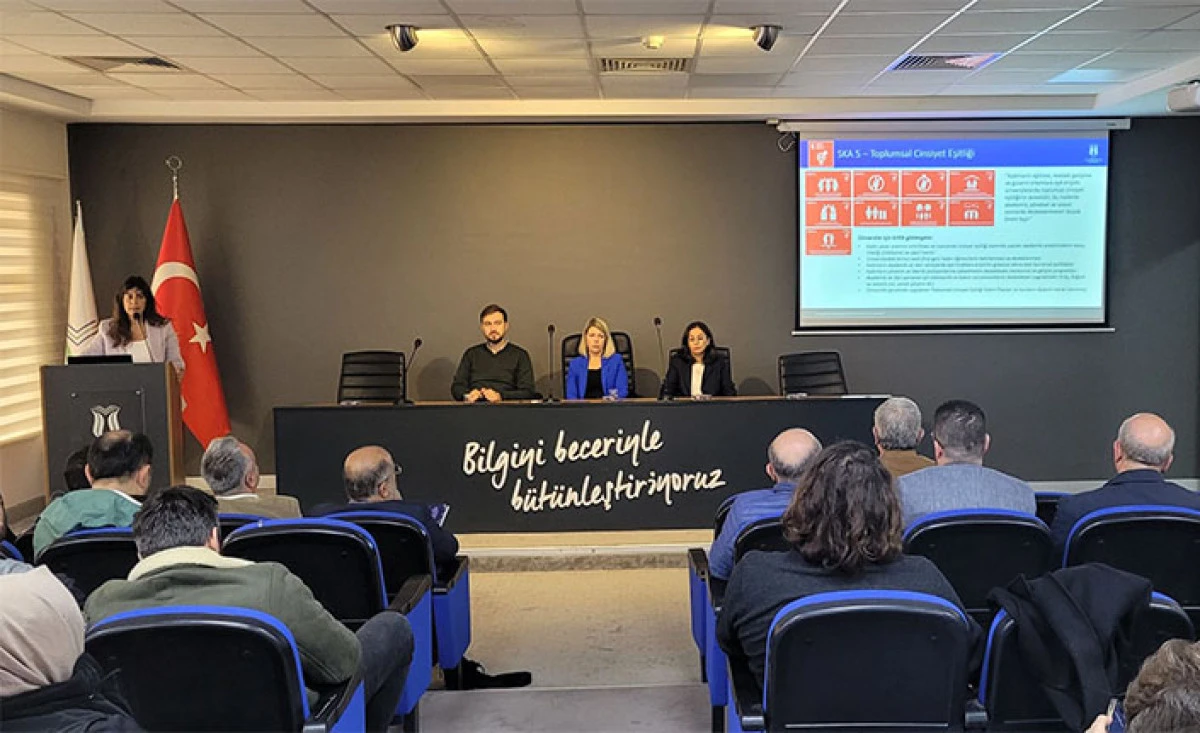 Ayrıca stratejik plan–SKA uyumu ve Yükseköğretim Kurulu (YÖK) 2030 Yükseköğretim Yol Haritası kapsamında öne çıkan başlıklar anlatıldı. İkinci oturumda ise ‘Su Verimliliği, Enerji Verimliliği ve Sıfır Atık Yönetimi’ konularına değinildi. İklim Değişikliği ve Sürdürülebilirlik Uygulama ve Araştırma Merkezi Müdür Yardımcısı Doç. Dr. Nazire Pınar Tanattı ile Merkez Yönetim Kurulu Üyesi Dr. Öğretim Üyesi Hülya Demirel tarafından yürütülen oturumda, merkezin faaliyetleri ve üniversitede kurulacak Çevre Yönetim Sistemi’nin temel bileşenleri ele alındı.